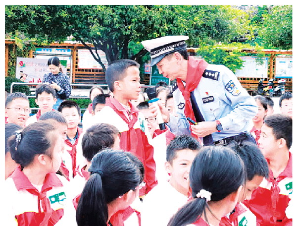 近日,恭城瑶族自治县法学会成员、县公安局交警大队副大队长荣改成在学校为师生宣传交通安全。今年以来,按照县法学会工作安排,荣改成积极参与法治进乡村、法治进校园、法治进企业宣传活动57次,受众达两万多人。周光宇 彭金平 摄