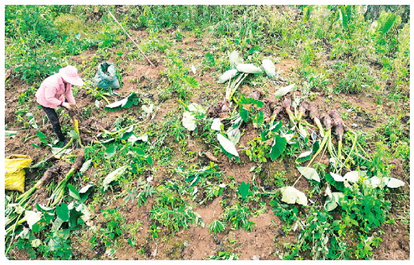 ▲采收工人采挖龙怀乡高山荔浦芋。(荔浦融媒体中心供图)