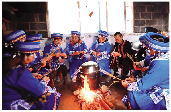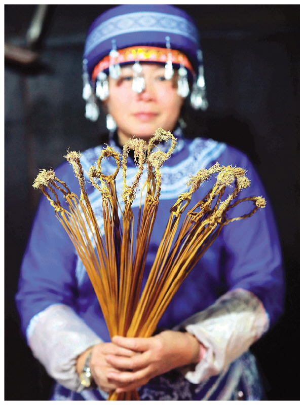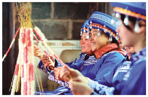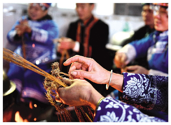 日前,记者来到伟江乡崇林村,走进石戍凤的家里,只见苗家阿哥阿嫂阿妹们围坐在厨房的火塘边,有说有笑,一起在编织挂粑粑果的绳结。