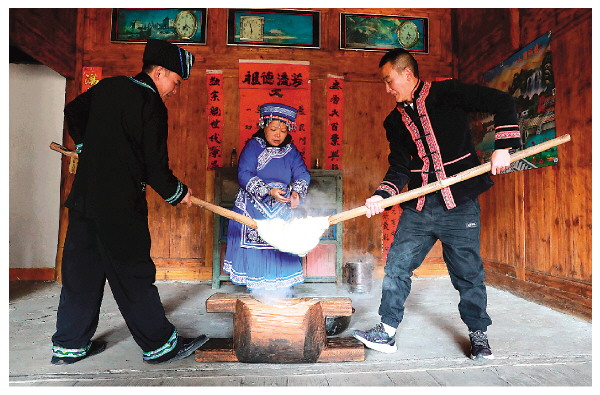 苗家阿哥将浸泡了一夜的糯米蒸上,一个多小时后,糯米已经蒸熟,绳结也编织得差不多了。两个阿哥将糯米饭倒进一个木头制作成的粑粑槽里,一人拿一根木棍,用力地舂糯米。待舂成糯米粑后,阿嫂们拿起一团糯米粑在手中,用另一只手取约莫指甲大的块状,粘在糯禾秆上,经过揉捏,粑粑果便串在了禾秆上。