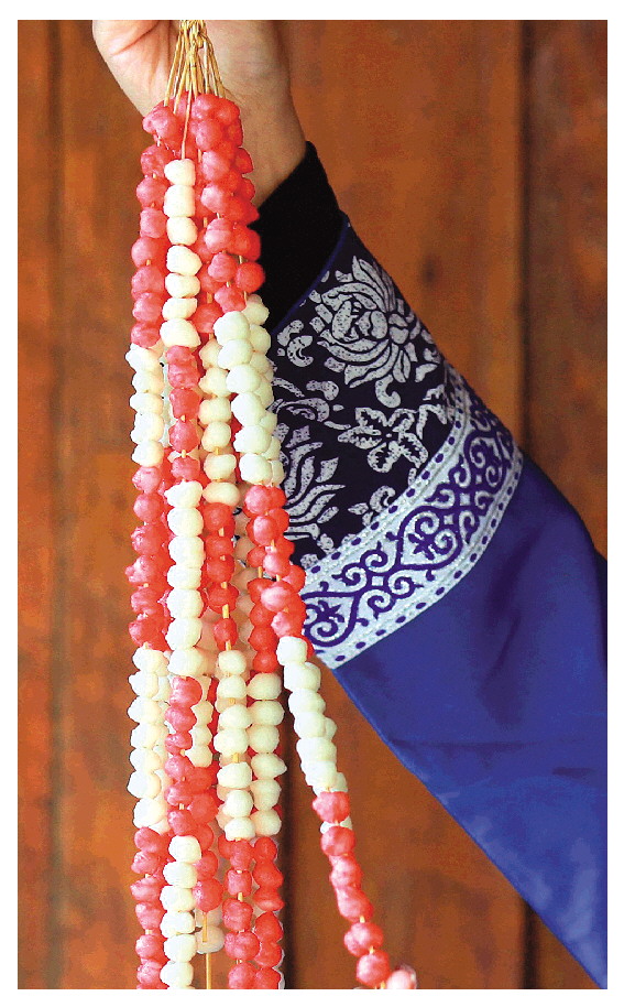 经过大家两三个小时的忙活,竹竿上挂满了红白相间的粑粑果,非常漂亮。“做粑粑果是个手工活,要人多在一起做才快,也更热闹!”石戍凤说,待粑粑果晾晒干后,再用食用油炸,打油茶时,将油炸好的粑粑果放入茶水中与米花、花生、葱花、辣椒等拌在一起,即成为餐桌上一道可口的特色美食。