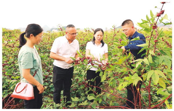 广西农业科学研究院专家(右二)到“洛神花”种植基地考察。