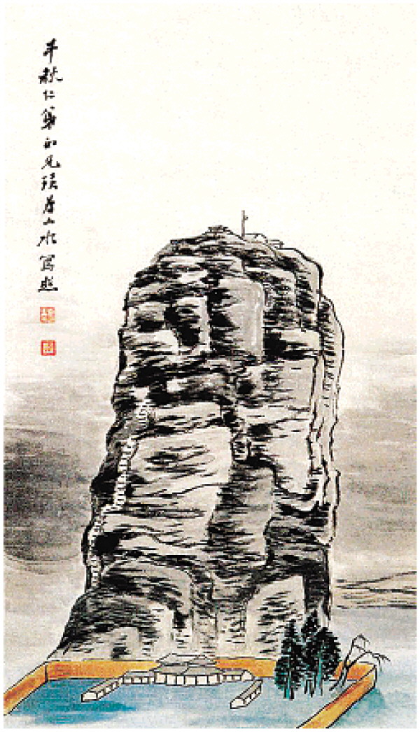 光绪三十二年初春,齐白石在桂林过了年,即将离开桂林,又画了一幅《独秀山图》,题诗一首:“笑看独秀如碑立,可惜周遭没字痕。只有晚风残照候,一竿灯火乱星辰。”这幅有题诗的《独秀山图》,以高远的仰望视角、皴笔交叠的浓墨,堆造出独秀山凹凸嶙峋,直插云霄的凛然气势。