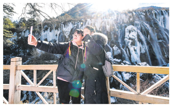 ◥1月4日,游客在九寨沟风景名胜区冰瀑景观前留影。当日,中国九寨沟第十九届国际冰瀑旅游节开幕式在四川九寨沟风景名胜区举行。