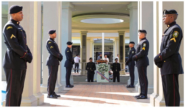 ▲1月9日,在巴拿马首都巴拿马城,士兵们守卫纪念“护旗运动”的“永恒之火”纪念碑。 新华社记者陈昊佺 摄