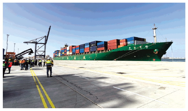 ▲1月9日,在埃及亚历山大,阿布基尔集装箱港口码头迎来第一艘船“中谷吉林”号靠港。 新华社发(徐刚 摄)