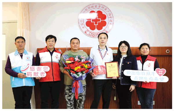 张昌骏(右三)完成造血干细胞捐献回到桂林后,市红十字会和中南大学湘雅二医院桂林医院为他颁发捐献证书和荣誉勋章。唐清 摄
