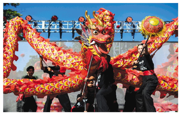 1月13日,演员在智利圣地亚哥举行的春节庆祝活动上表演舞龙。 新华社发(豪尔赫·比列加斯摄)