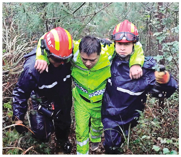 消防救援人员搀扶着已虚脱的何先生下山。李良哲 摄