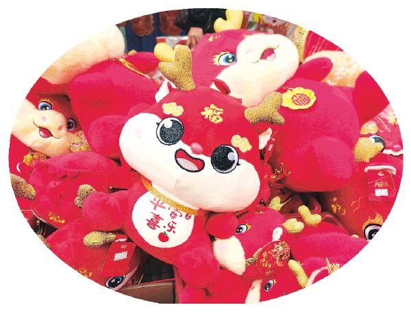 □本报记者黄敏 文/摄 俗话说“踏进腊月门,年味铺满集”。随着腊月到来,春节的脚步越来越近,年的味道越来越浓,市民采办年货的热情也逐渐高涨。 近日,记者前往瓦窑商品批发城、各大商超等置办年货的热门地看到,虽然距离农历新年还有20多天,但灯笼、对联、“福”字和窗花等富有年味的装饰品,喜庆大气的“新年战袍”“新年配饰”等已成为不少商铺展示销售的焦点,其中满满当当的“龙”元素烘托出浓浓的龙年春节气氛,生肖龙相关产品成了年货市场“当之无愧”的主角。