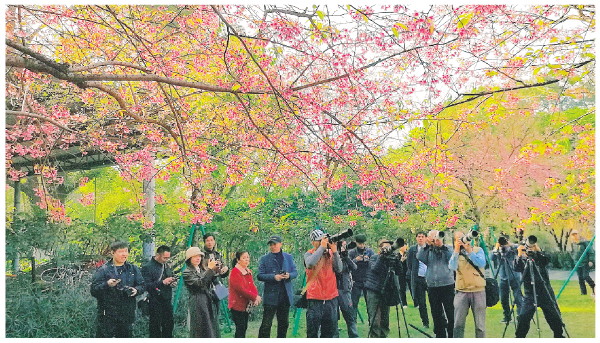 日前,南溪山公园樱花园里种植的冬樱盛开,吸引了众多市民、游客前来赏花拍照。