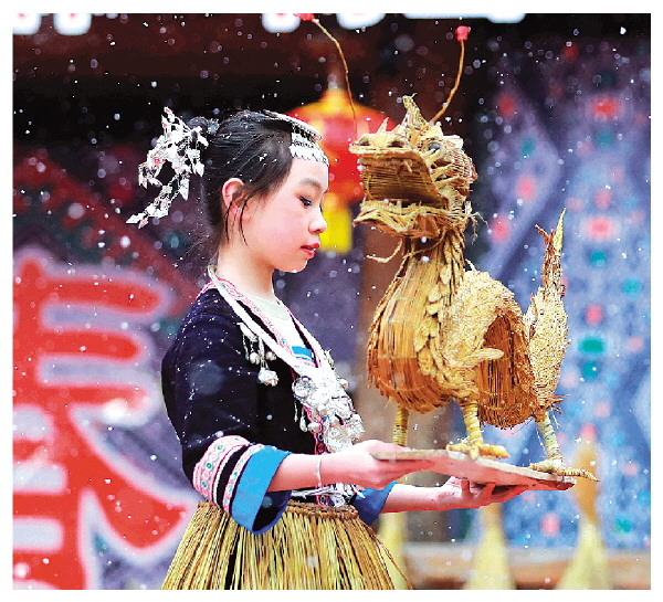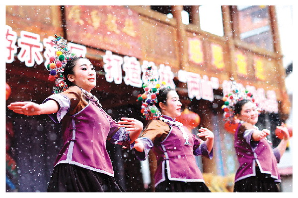 演出现场,雪花飘落,轻盈如羽,侗族群众跳起美丽的舞蹈,脸上洋溢着笑容。
