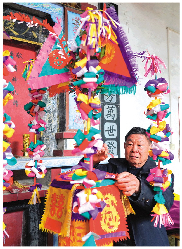 村民正在为花炮做最后的装饰。 黎晓蝶 摄