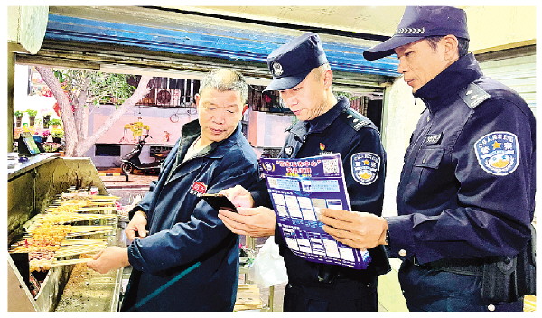 象山公安分局桂青派出所民警在辖区宵夜摊开展节前安全检查,并教群众下载国家反诈中心APP。 易丹 摄