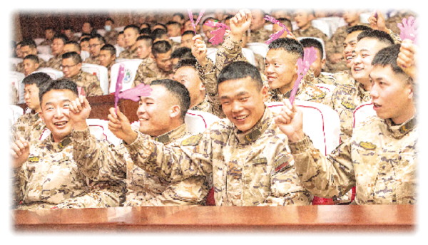 晚会上,来自新疆的三位官兵倾心演唱了维吾尔语歌曲《再见我的花》,虽然大多数观众听不懂歌词表达的意思,但从演唱者投入的演唱中感受到了他们对家乡的思念、对未来的期许、对使命的忠诚以及对职责的担当;几位“兵哥哥”截取了几首人们喜闻乐见的乐曲中最精彩的部分,串联成一首舞动青春的欢快乐曲,伴着他们整齐的舞步,引得场下观众尖叫声不断,欢呼声此起彼伏;官兵们自发组建的薪火乐队带来了《海阔天空》《你的答案》等曲目,朴实无华的歌词伴着动人的旋律,不仅勾起了大家的青春回忆,更加坚定了官兵们不忘初心、砥砺前行、努力奋斗的信心和决心……