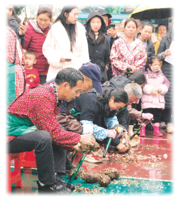 刮芋头比赛中参赛者正认真刮芋头。记者何月 摄