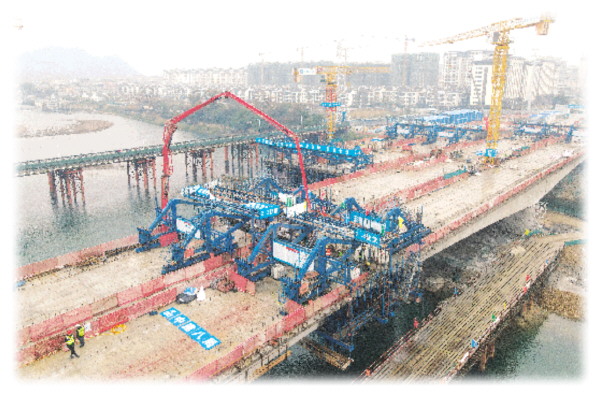 新建净瓶山桥右幅辅道桥现浇箱梁合龙浇筑现场。 唐毓健 摄