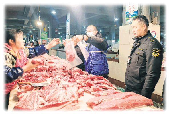 “请出示你们的营业执照、进货票据……最近购买年货的顾客多,一定要把好进货质量关,诚信经营……”2月2日上午,南站市场人头攒动,市场监管执法人员一边提醒商户规范经营,一边进行抽检工作。执法人员随机来到一家猪肉摊前,首先向摊主索要猪肉的进货凭证、检疫证明等,随后通过购买形式在摊位上抽取一定量的鲜肉进行封存并认真做好记录。现场不少市民仔细观摩抽样流程,并主动上前询问执法人员选购猪肉的常识等。执法人员耐心进行了讲解。