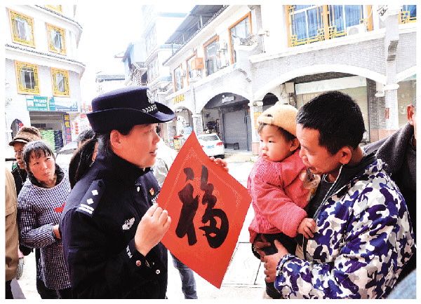 挥毫泼墨送春联,声声祝福迎新春。近日,恭城瑶族自治县公安局邀请该县书法家协会深入莲花镇开展“新春送平安 新春送万福”活动,为群众免费书写春联、“福”字,受到广大群众的热烈欢迎。