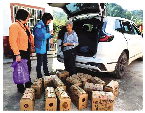 阳朔县普益乡大山村村民练起龙、覃娥英夫妇用驻村第一书记廖建东设计定制的礼品盒包装土鸡,按订单送给城里客户,他家养殖的上百只土鸡销售一空。桂林市林业和园林局派驻阳朔县普益乡大山村的工作队,在巩固拓展脱贫攻坚成果与乡村振兴有效衔接工作中,既当“参谋”又当“红娘”,有效破解“种什么、养什么,怎么种、怎么养,怎么卖、卖去哪”这三大“捆”住农民群众致富手脚的难题,确保村民致富不返贫。梁敏力 摄