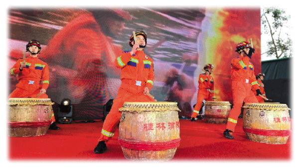 当天晚会上,消防员们表演的威风锣鼓。