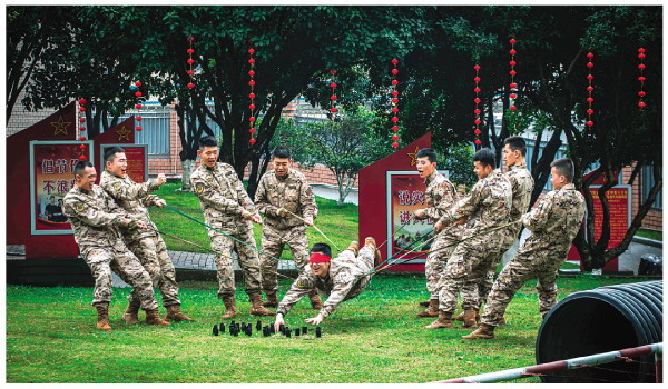 临近春节,武警桂林支队开展形式多样的活动迎接新春佳节。图为武警官兵正在开展团队游戏,拉近彼此的距离。张辰飞 摄