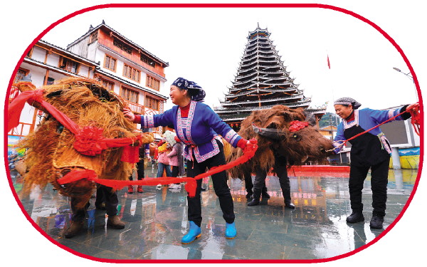 在高大的侗族鼓楼下,十几位身着特色民族服装的村民,牵着两头大“春牛”,赶着一群小“春牛”,尽情地表演着一年一度的传统节目——“闹春牛”。