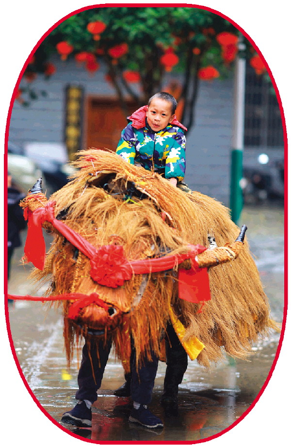 2月4日,在龙胜各族自治县平等镇广南村的“闹春牛”活动中,一名侗族孩子骑在“春牛”上。