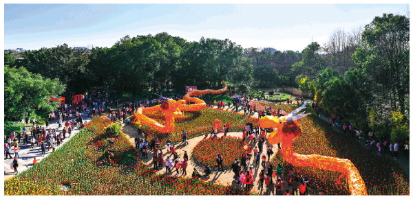 ▲2月10日,农历大年初一,在訾洲公园草坪上,6个色系50个品种约12万盆荷兰郁金香在阳光下绽放,两条金黄的游龙造型在郁金香花海中穿梭,市民和游客赏花过大年。 记者唐艳兰 通讯员李腾钊 摄