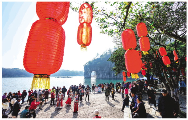 ▲2月10日是龙年新年第一天,桂林各景区景点迎来了全国各地的游客。暖洋洋的晴天、美好的山水人文让游客心情舒畅。图为游客在象山景区游玩。 记者何平江 摄