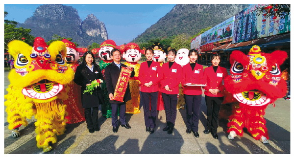 ▲芦笛景区导游员向市民、游客拜年。 记者徐莹波 摄