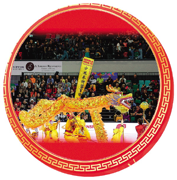 这是2月4日在意大利斯坎迪奇排球俱乐部主场体育馆拍摄的比赛局间休息时间的舞龙表演。