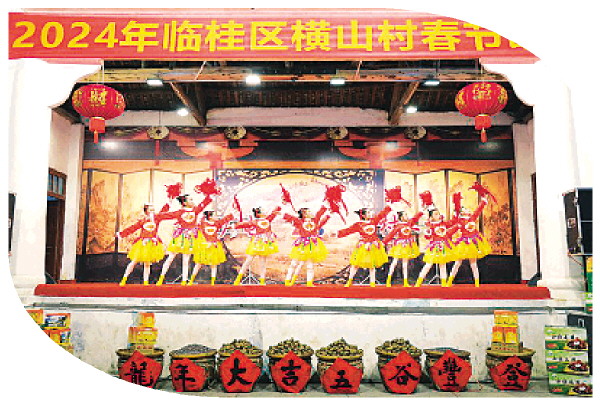 临桂区四塘镇的“村晚”,龙胜各族自治县广南村的“闹春牛”,恭城瑶族自治县的瑶族八音表演,永福县的“凤山之春彩调展演”,全州县的桂剧文化传承演出,荔浦市的纸扎工艺巡游……接地气的民俗活动加持,喜庆的文化年味弥漫全城。