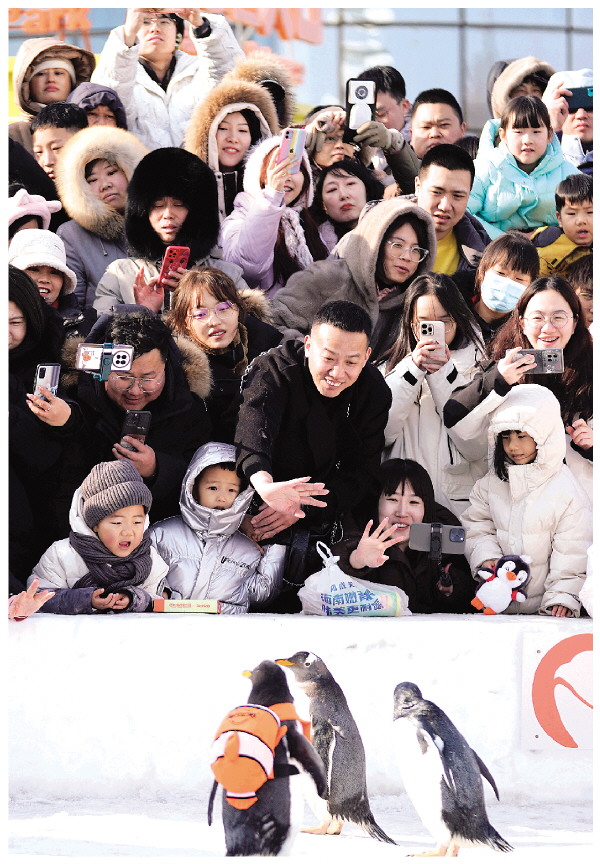 ◥2月13日,游客在哈尔滨极地公园广场观看企鹅巡游。 新华社记者王建威 摄