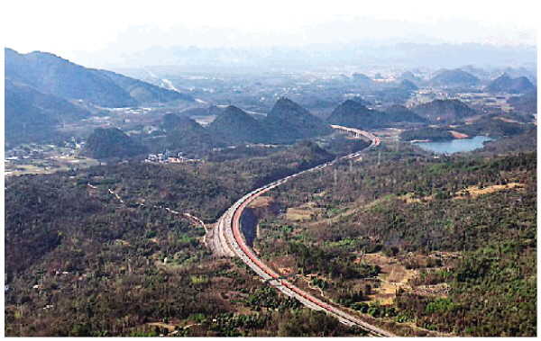 为保障行车安全,灌(阳)凤(凰)高速全州石塘段铺上彩色(红色)抗滑路面,从高空俯瞰,公路向远方延伸,犹如一条飘动的彩带。起伏的山峦、蓝色的湖泊、宁静的村庄、青山中的高压输电塔等与路面交相辉映,构成一幅美丽的乡村画卷。图为近日无人机拍摄的灌凤高速全州县石塘镇水澄村画面。 邓琳 蒋儒文 摄