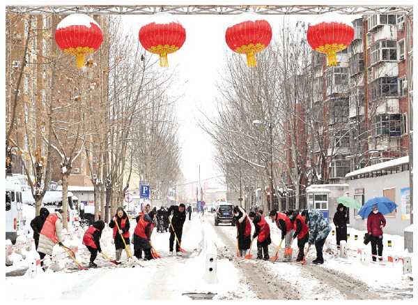 2月21日,志愿者在河北省石家庄市中华北大街附近清扫积雪。