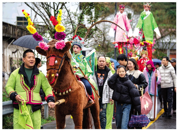 2月22日,在浙江省金华市武义县俞源乡俞源古村,村民在举行传统民俗活动“擎台阁”。