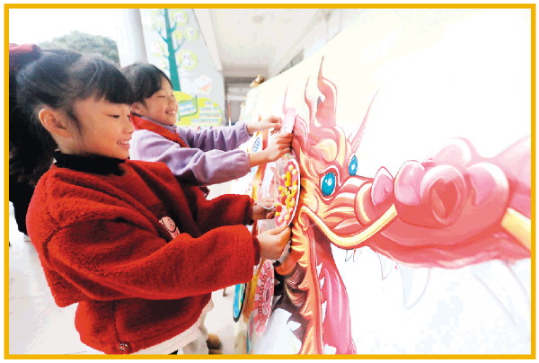 2月25日上午,市英才小学开展“乘风破浪启新程 龙腾学子志飞扬”活动,同学们在装点象征乘风破浪的金龙。 记者陈静 摄