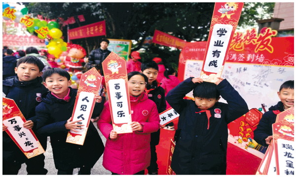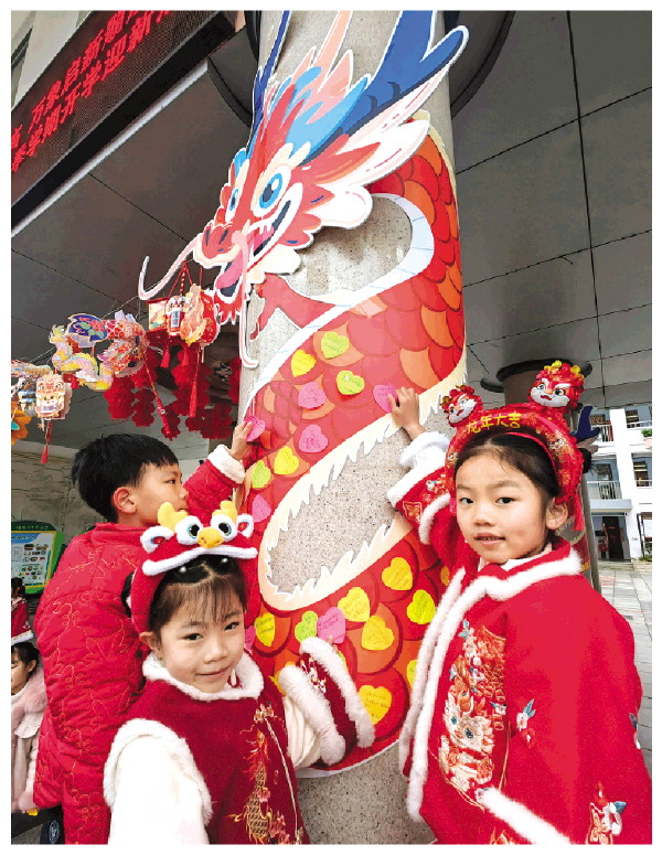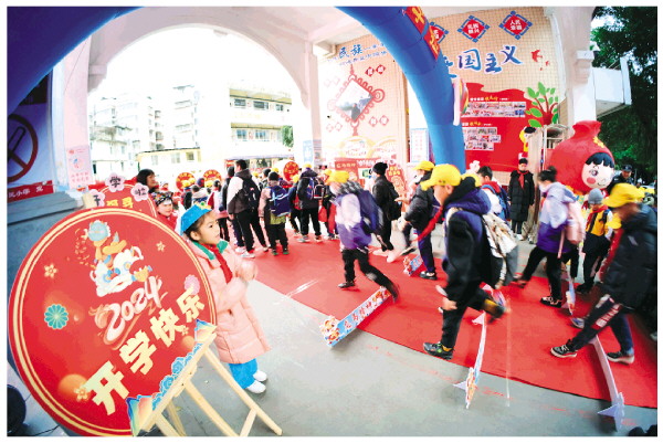 2月25日上午,在市中华小学,校门口的“龙”主题迎新屏风、随处悬挂的龙灯、柱子上的“盘龙”装饰……将开学的仪式感拉满。孩子们将手写的心愿卡当作“龙鳞”贴在龙柱上,寄托美好愿望。