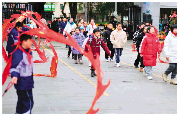 2月25日,市将军桥小学组织学生在校门口舞龙形绸缎,欢迎同学们返校。记者苏展 摄