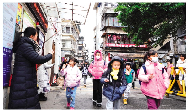 2月25日上午,市榕湖小学学生回校注册报到,在校门口与等候的老师互致问候。记者何平江 摄