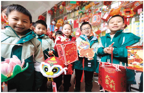 2月25日,在市育才小学,孩子们展示龙年主题的花灯。 记者陈静 摄