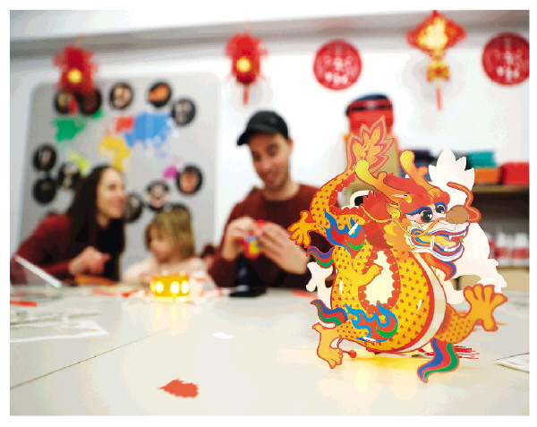 ◤2月24日,人们在比利时班什举行的“金龙迎新——2024比利时生肖设计展”期间体验制作龙形灯笼。