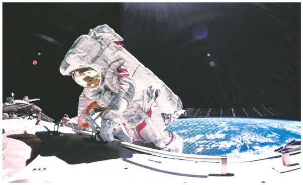 3月2日,在北京航天飞行控制中心拍摄的神舟十七号航天员汤洪波在空间站组合体舱外作业。新华社记者李贺 摄