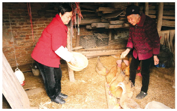 ▲婆婆韦水英帮着陈秀旺一起干活。 记者刘菁 摄