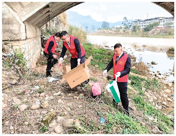 永福农商行基层党支部组织员工在清理河岸垃圾。