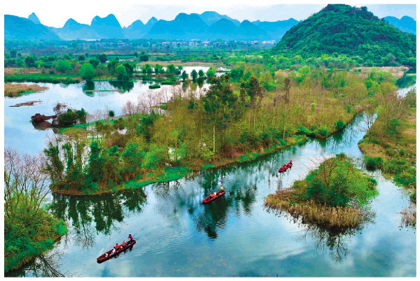 春回大地,桂林会仙喀斯特国家湿地公园披上新绿,处处充满勃勃生机。会仙湿地被誉为“漓江之肾”,近年来,我市持续开展退塘(耕)还湿、古运河修复工程—清淤工程、农村生活污水处理设施建设等工作,有效地恢复了会仙喀斯特湿地的生态系统完整性,保护和改善了湿地生物栖息环境。通过一系列生态保护措施,现在的会仙湿地水更清草更绿,成了众多鸟类、鱼虾的家园,也成为人们休闲的好去处。