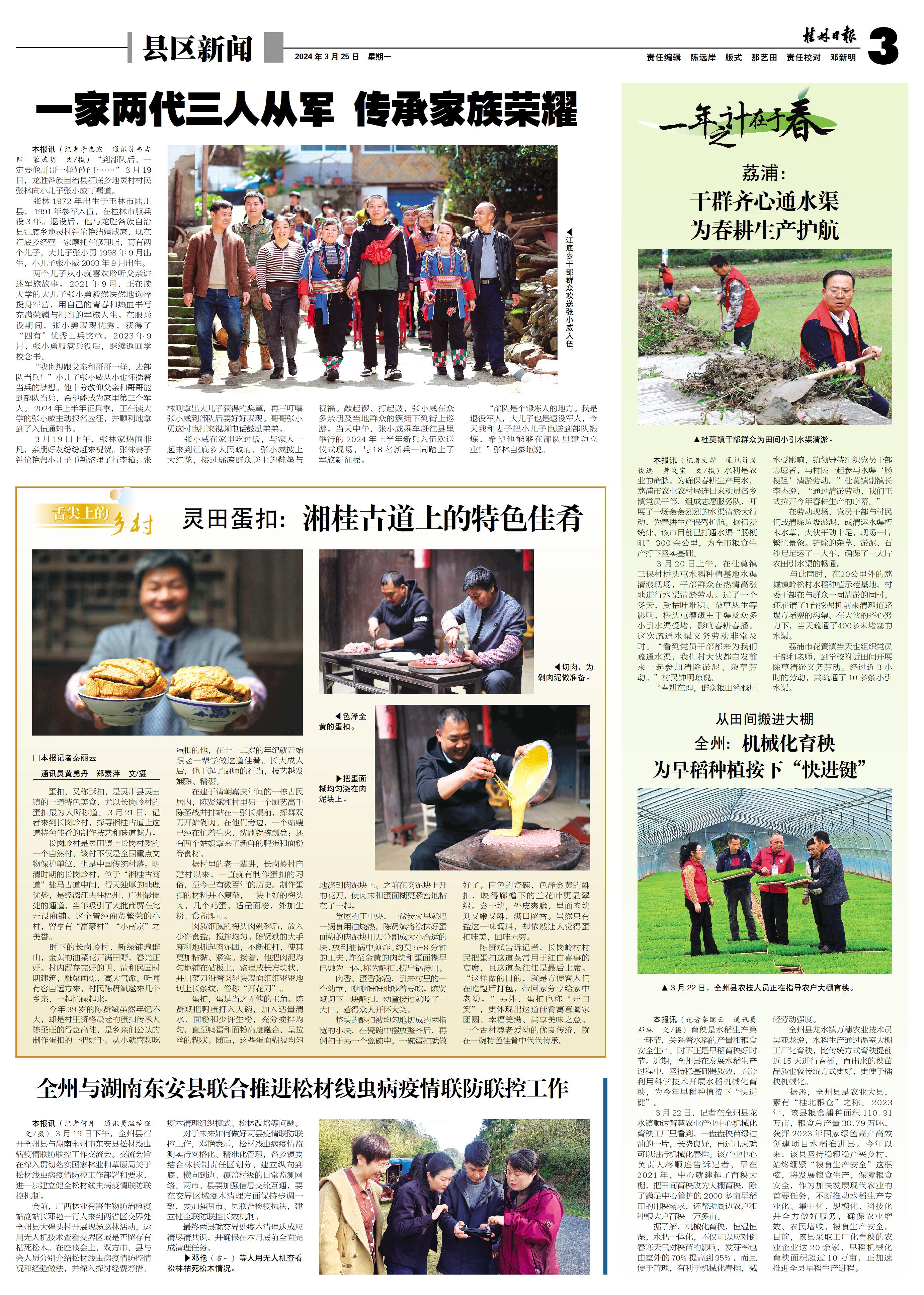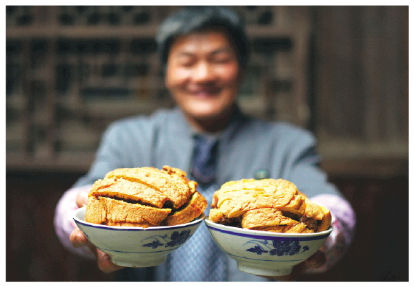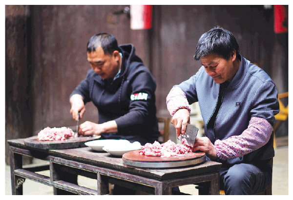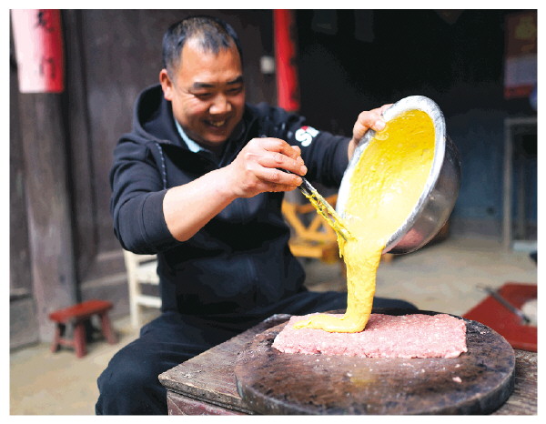 □本报记者秦丽云 通讯员黄勇丹 郑素萍 文/摄 蛋扣,又称酥扣,是灵川县灵田镇的一道特色美食,尤以长岗岭村的蛋扣最为人所称道。3月21日,记者来到长岗岭村,探寻湘桂古道上这道特色佳肴的制作技艺和味道魅力。 长岗岭村是灵田镇上长岗村委的一个自然村,该村不仅是全国重点文物保护单位,也是中国传统村落。明清时期的长岗岭村,位于“湘桂古商道”盐马古道中间,得天独厚的地理优势,是经漓江去往梧州、广州最便捷的通道,当年吸引了大批商贾在此开设商铺。这个曾经商贸繁荣的小村,曾享有“富豪村”“小南京”之美誉。 时下的长岗岭村,新绿铺遍群山,金黄的油菜花开满田野,春光正好。村内留存完好的明、清和民国时期建筑,雕梁画栋,高大气派。听闻有客自远方来,村民陈贤斌邀来几个乡亲,一起忙碌起来。 今年39岁的陈贤斌虽然年纪不大,却是村里资格最老的蛋扣传承人陈圣旺的得意高徒,是乡亲们公认的制作蛋扣的一把好手。从小就喜欢吃蛋扣的他,在十一二岁的年纪就开始跟老一辈学做这道佳肴。长大成人后,他干起了厨师的行当,技艺越发娴熟、精湛。 在建于清朝嘉庆年间的一栋古民居内,陈贤斌和村里另一个厨艺高手陈圣战并排站在一张长桌前,挥舞双刀开始剁肉。在他们旁边,一个姑嫂已经在忙着生火,洗刷锅碗瓢盆;还有两个姑嫂拿来了新鲜的鸭蛋和面粉等食材。 据村里的老一辈讲,长岗岭村自建村以来,一直就有制作蛋扣的习俗,至今已有数百年的历史。制作蛋扣的材料并不复杂,一块上好的梅头肉,几个鸡蛋,适量面粉,外加生粉、食盐即可。 肉质细腻的梅头肉剁碎后,放入少许食盐,搅拌均匀。陈贤斌的大手麻利地抓起肉泥团,不断拍打,使其更加粘黏、紧实。接着,他把肉泥均匀地铺在砧板上,整理成长方块状,并用菜刀沿着肉泥块表面细细密密地切上长条纹,俗称“开花刀”。 蛋扣,蛋是当之无愧的主角。陈贤斌把鸭蛋打入大碗,加入适量清水、面粉和少许生粉,充分搅拌均匀,直至鸭蛋和面粉高度融合,呈拉丝的糊状。随后,这些蛋面糊被均匀地浇到肉泥块上。之前在肉泥块上开的花刀,使肉末和蛋面糊更紧密地粘在了一起。 堂屋的正中央,一盆炭火早就把一锅食用油烧热。陈贤斌将涂抹好蛋面糊的肉泥块用刀分割成大小合适的块,放到油锅中煎炸。约莫5-8分钟的工夫,炸至金黄的肉块和蛋面糊早已融为一体,称为酥扣,捞出锅待用。 肉香、蛋香弥漫,引来村里的一个幼童,咿咿呀呀地吵着要吃。陈贤斌切下一块酥扣,幼童接过就咬了一大口,惹得众人开怀大笑。 整块的酥扣被均匀地切成约两指宽的小块,在瓷碗中摆放整齐后,再倒扣于另一个瓷碗中,一碗蛋扣就做好了。白色的瓷碗,色泽金黄的酥扣,映得廊檐下的兰花叶更显翠绿。尝一块,外皮爽脆,里面肉块则又嫩又酥,满口留香。虽然只有盐这一味调料,却依然让人觉得蛋扣味美,回味无穷。 陈贤斌告诉记者,长岗岭村村民把蛋扣这道菜常用于红白喜事的宴席,且这道菜往往是最后上席。“这样做的目的,就是方便客人们在吃饱后打包,带回家分享给家中老幼。”另外,蛋扣也称“开口笑”,更体现出这道佳肴寓意阖家团圆、幸福美满、共享美味之意。一个古村尊老爱幼的优良传统,就在一碗特色佳肴中代代传承。
