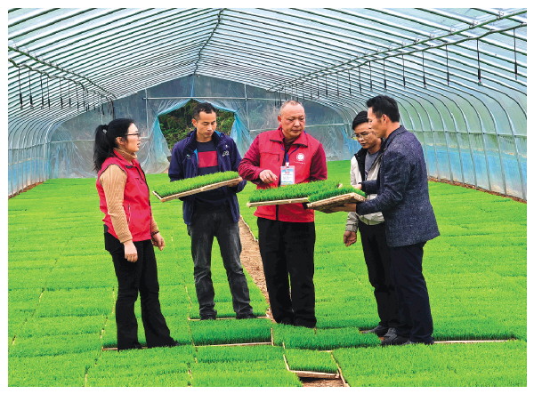 3月22日,全州县农技人员正在指导农户大棚育秧。