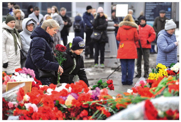 3月24日,人们在俄罗斯莫斯科近郊恐袭事件现场附近献花,悼念遇难者。新华社发(亚历山大摄)
